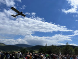 Mimo kapryśnej, zmiennej pogody dzisiejsza (10 lipca 2022 r.) rekonstrukcja historyczna udała się znakomicie. Mieliśmy silny opad deszczu oraz niskie podstawy, na przemian z bezchmurnym niebem. Z jednej strony warunki raczej na piwo w barze - z drugiej jednak strony, przy szczęściu jakie powinno cechować lotników, trafialiśmy bezbłędnie w bardzo dobre warunki VFR. No może z jednym wyjątkiem - nie było skoków. Mimo przygotowania dziesięciu spadochroniarzy, ze względu na prędkość wiatru i jego kierunek (niebezpieczeństwo zawietrznej), z ciężkim sercem pojąłem decyzję o odwołaniu tej części pokazu. Rzeczywiste warunki panujące w godzinie pokazu potwierdziły, że decyzja ta była ze wszech miar słuszna. Bezpieczeństwo przede wszystkim.